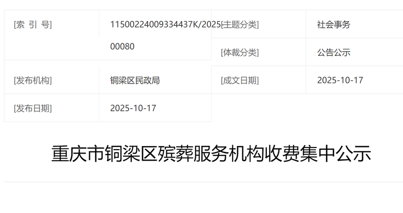 重庆市铜梁区殡葬服务机构收费集中公示